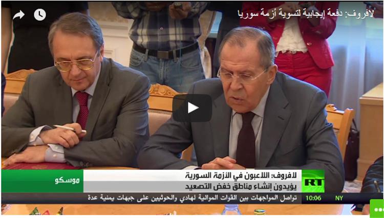وقال لافروف في مستهل اللقاء إن اللاعبين الخارجيين الرئيسيين في عملية التسوية بسوريا يدعمون جهود إقامة مناطق لتخفيف التوتر. وتابع أنه إذا تمت ترجمة هذه التصريحات بشأن تأييد مناطق تخفيف التوتر السورية، إلى دعم عملي، فسيتيح ذلك تثبيت وقف إطلاق النار بين الحكومة والمعارضة، لكي تتمكن كافة الأطراف من تركيز جهودها بصورة جماعية على إزالة الخطر الإرهابي. وأعاد إلى الأذهان أن هذا الخطر يحدق بلبنان أيضا.