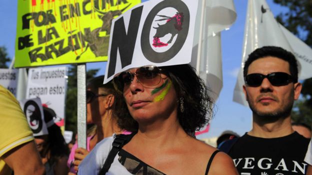 ورفع المتظاهرون في مدريد لافتات كتب عليها "مصارعة الثيران مدرسة للقسوة"، و"مصارعة الثيران عار وطني."